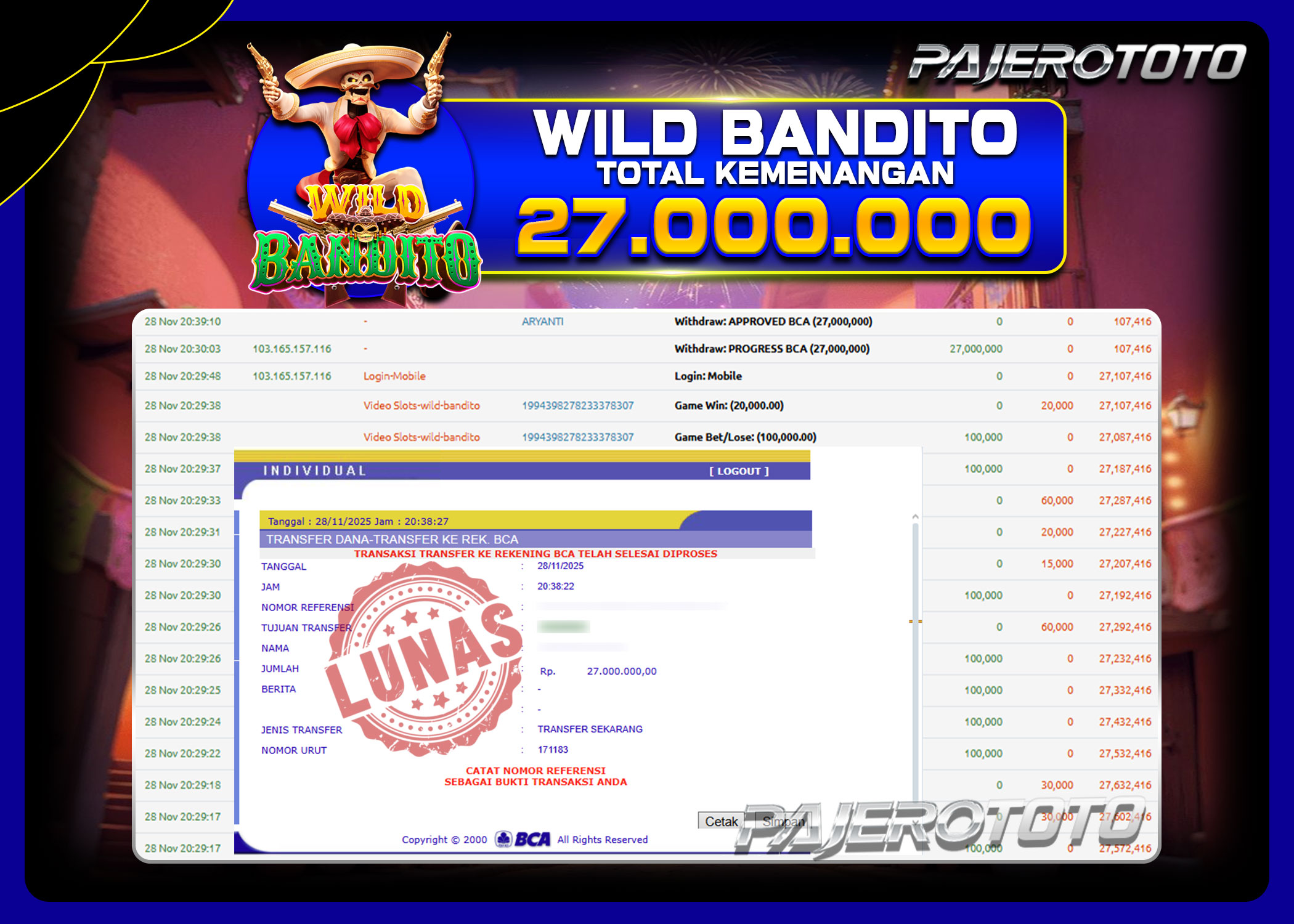 JACKPOT PAJEROTOTO SLOT WILD BANDITO Rp 27.000.000, – 28 NOVEMBER 2025 – LUNAS..!!