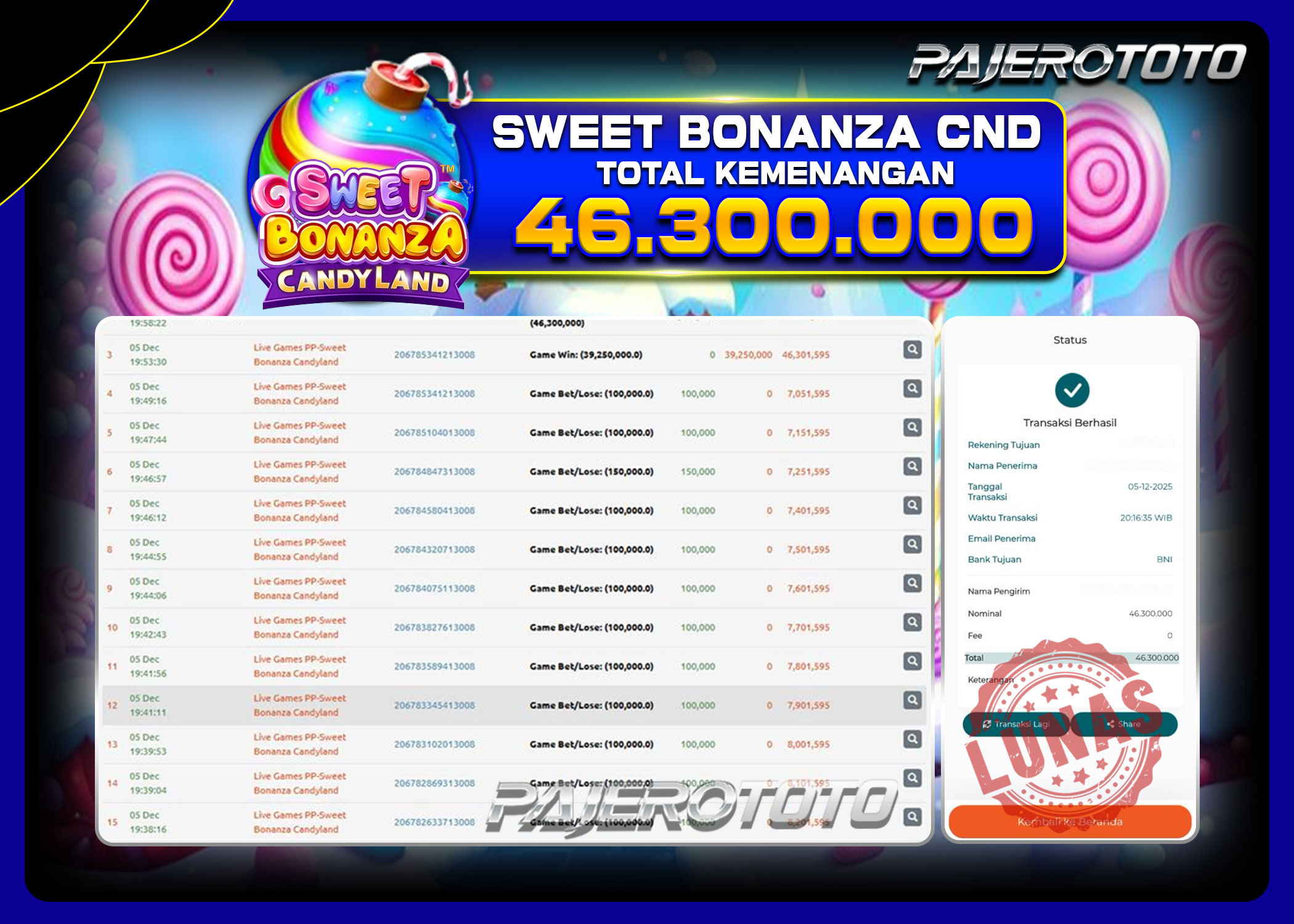 JACKPOT PAJEROTOTO LIVE CASINO SWEET BONANZA CND Rp 46.300.000,- 05 DESEMBER 2025 – LUNAS..!!