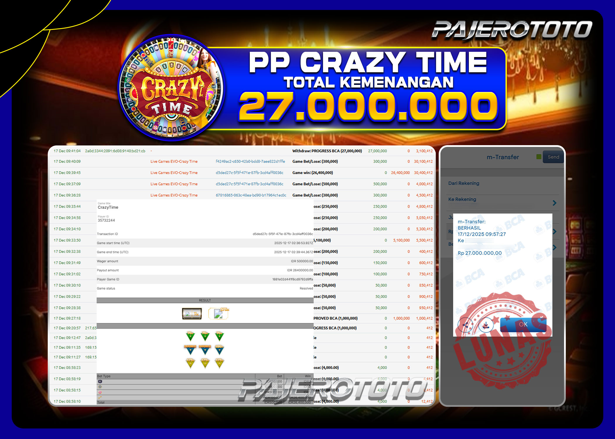 JACKPOT PAJEROTOTO LIVE CASINO PP CRAZY TIME Rp 27.000.000,- 17 DESEMBER 2025 – LUNAS..!!