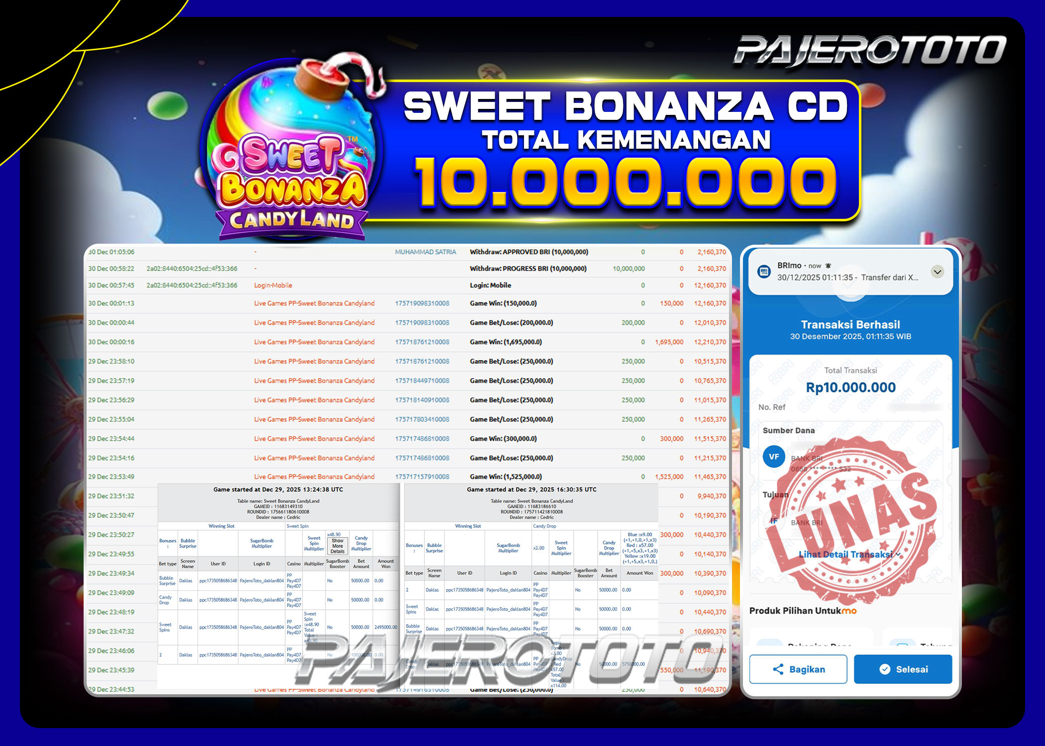 JACKPOT PAJEROTOTO LIVE CASINO SWEET BONANZA CND Rp 10.000.000,- 30 DESEMBER 2025 – LUNAS..!!