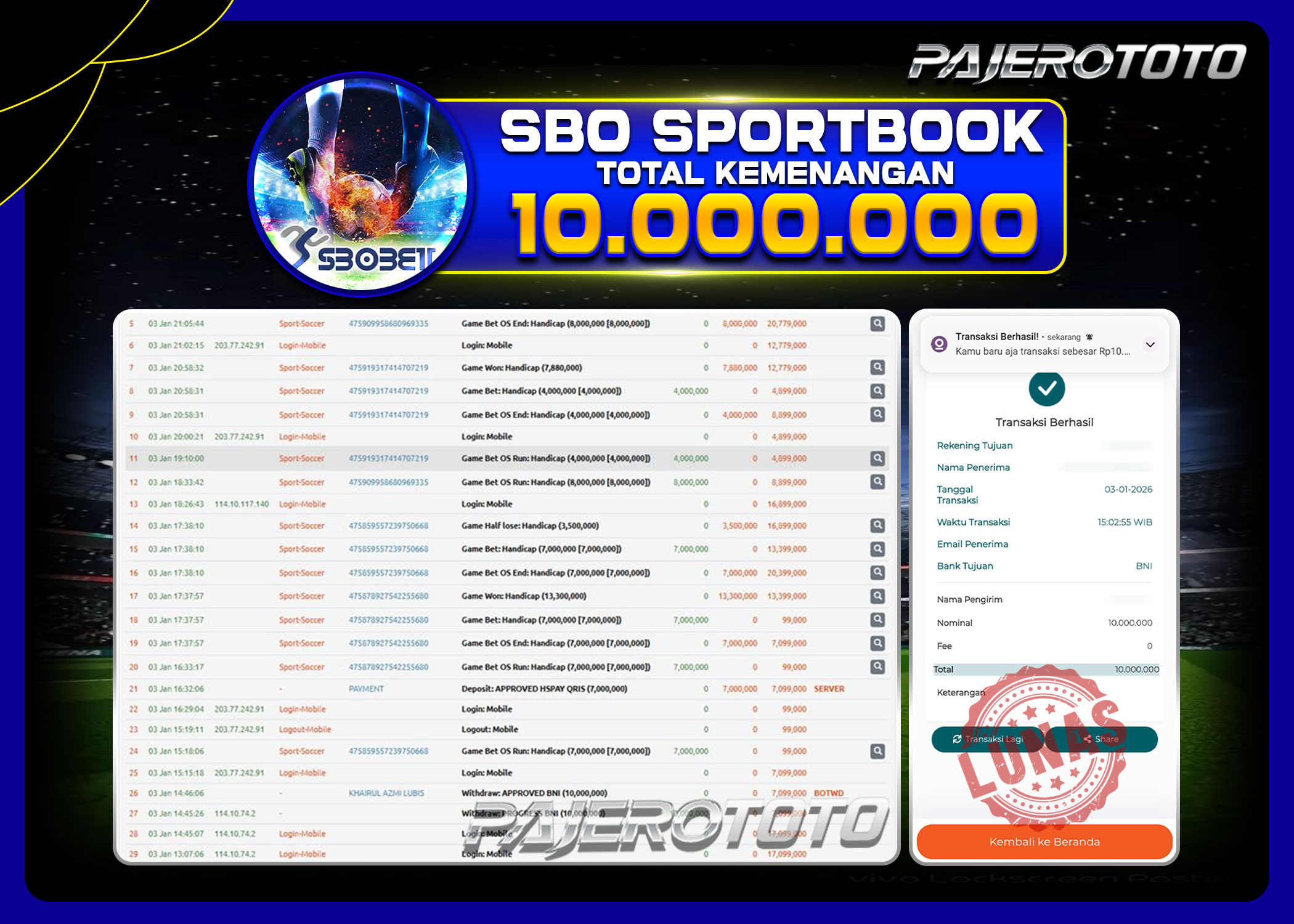 JACKPOT PAJEROTOTO SPORTSBOOK SBO Rp 10.000.000,- 03 JANUARY 2026 – LUNAS..!!