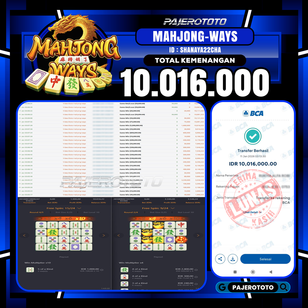 JACKPOT PAJEROTOTO SLOT MAHJONG WAYS   Rp 10.016.000, – 11 JANUARY 2026 – LUNAS..!!