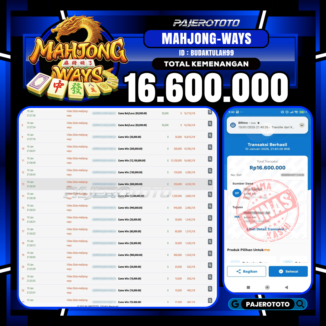 JACKPOT PAJEROTOTO SLOT MAHJONG WAYS Rp 16.600.000, – 10 JANUARY 2026 – LUNAS..!!