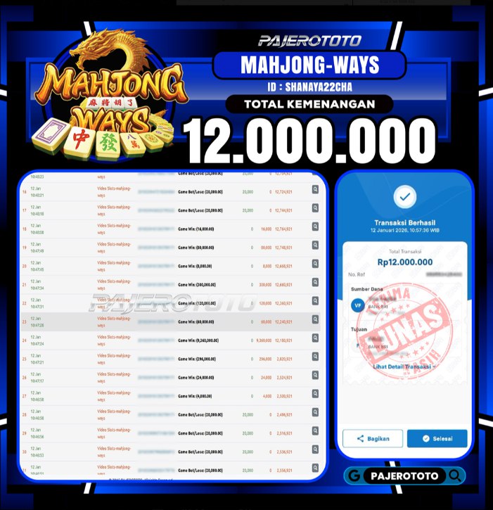 JACKPOT PAJEROTOTO SLOT MAHJONG WAYS Rp 12.000.000, – 12 JANUARY 2026 – LUNAS..!!
