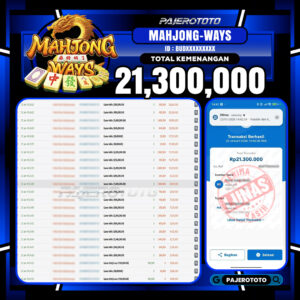 Slot online adalah salah satu game favorit yang tersedia di situs pajerototo yang dapat di maikan semua kalangan dari remaja hingga dewasa. Berikut adalah bukti pembayaran kemenangan salah satu pemain setia situs pajerototo di permainan Slot Online MAHJONG WAYS sebesar Rp 21.300.000,- dan sudah kami bayar secara lunas.