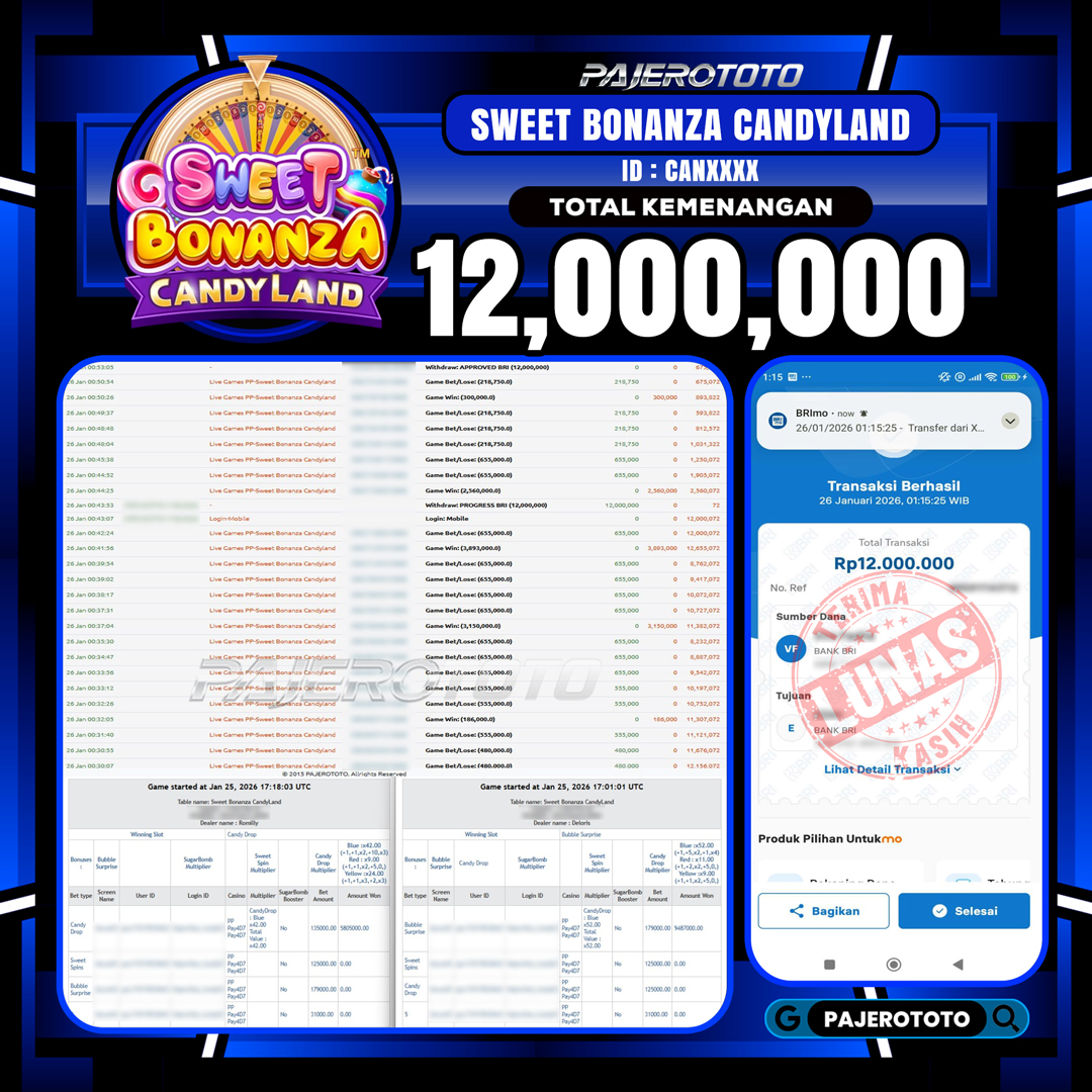 JACKPOT PAJEROTOTO LIVE CASINO SWEET BONANZA CANDYLAND Rp 12.000.000,- 26 JANUARY 2026 – LUNAS..!!