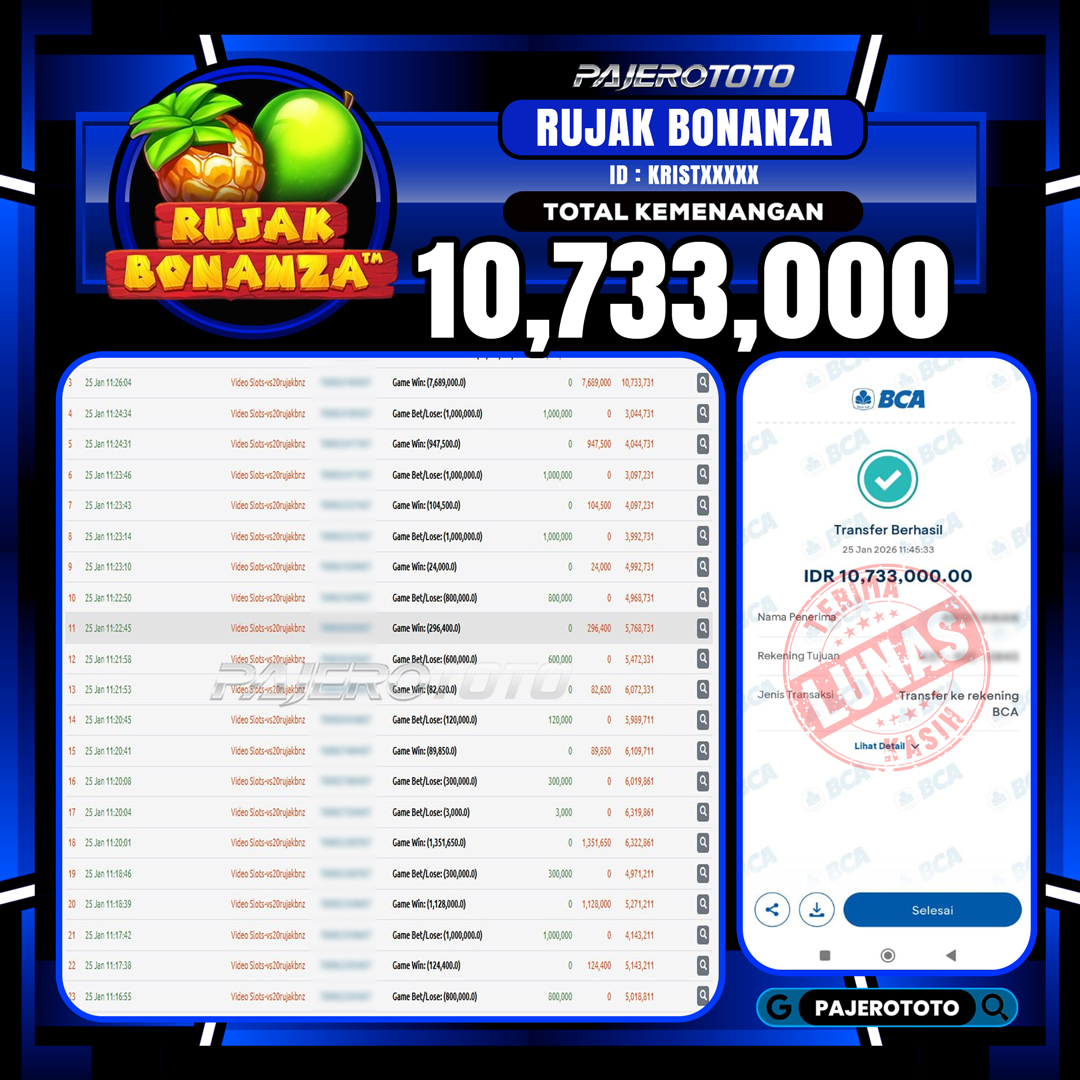 JACKPOT PAJEROTOTO SLOT RUJAK BONANZA Rp 10,733,000,- 25 JANUARY 2026 – LUNAS..!!