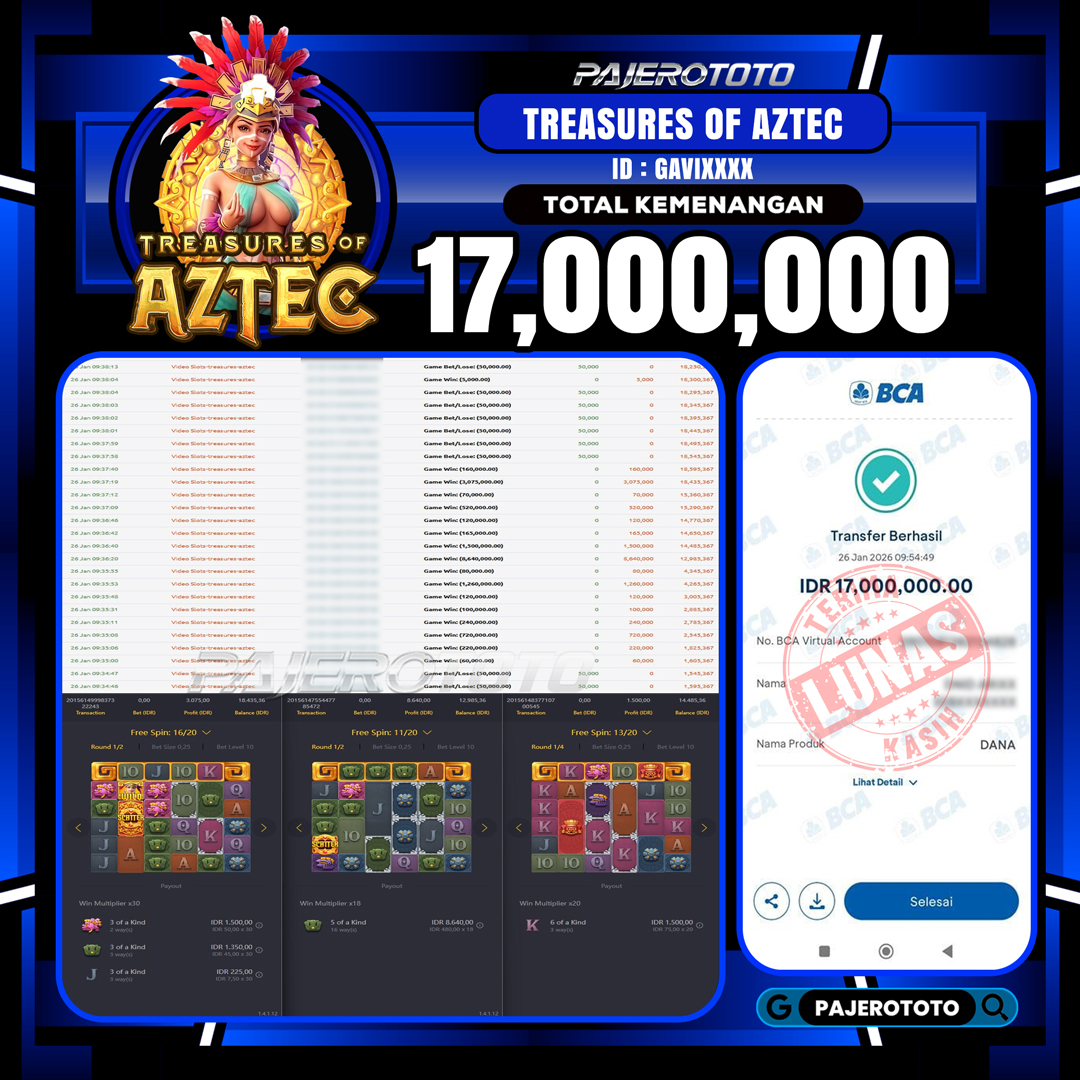 JACKPOT PAJEROTOTO SLOT TREASURES OF AZTEC Rp 17,000,000,- 26 JANUARY 2026 – LUNAS..!!