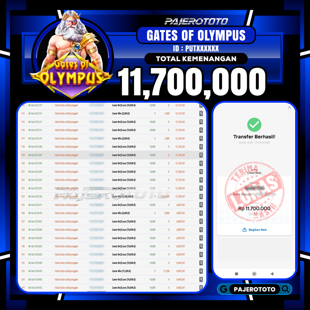 JACKPOT PAJEROTOTO SLOT GATES OF OLYMPUS 11,700,000,- 06 MARET 2026 – LUNAS..!!