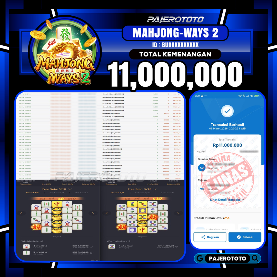 JACKPOT PAJEROTOTO SLOT MAHJONG WAYS 2 Rp 11,000,000,- 06 MARET 2026 – LUNAS..!!