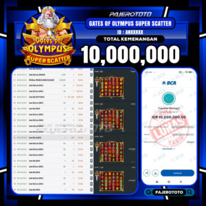 Slot  online adalah salah satu game favorit yang tersedia di situs pajerototo yang dapat di maikan semua kalangan dari remaja hingga dewasa. Berikut adalah bukti pembayaran kemenangan salah satu pemain setia situs pajerototo di permainan Slot Online GATES OF OLYMPUS SUPER SCATTER sebesar Rp 10,000,000,- dan sudah kami bayar secara lunas.