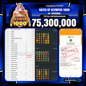 Slot online adalah salah satu game favorit yang tersedia di situs pajerototo yang dapat di maikan semua kalangan dari remaja hingga dewasa. Berikut adalah bukti pembayaran kemenangan salah satu pemain setia situs pajerototo di permainan Slot Online GATES OF OLYMPUS 1000 sebesar Rp 75,300,000,- dan sudah kami bayar secara lunas.