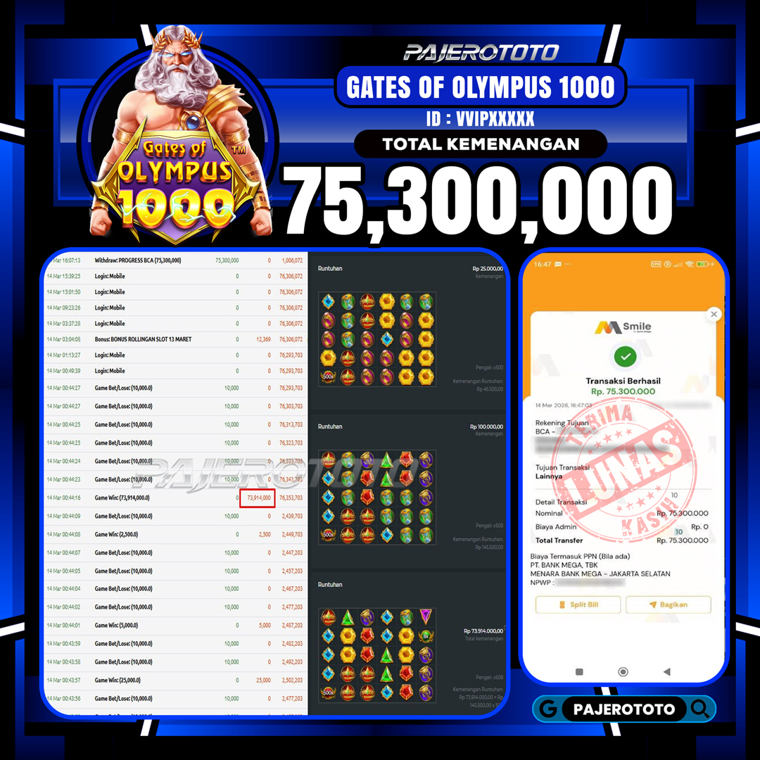 JACKPOT PAJEROTOTO SLOT GATES OF OLYMPUS 1000 Rp 75,300,000, – 14 MARET 2026 – LUNAS..!!