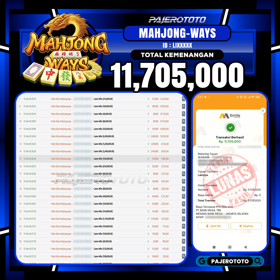 JACKPOT PAJEROTOTO SLOT MAHJONG WAYS Rp 11,705,000, – 15 MARET 2026 – LUNAS..!!