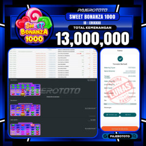 Slot online adalah salah satu game favorit yang tersedia di situs pajerototo yang dapat di maikan semua kalangan dari remaja hingga dewasa. Berikut adalah bukti pembayaran kemenangan salah satu pemain setia situs pajerototo di permainan Slot Online SWEET BONANZA 1000 sebesar Rp 13,000,000,- dan sudah kami bayar secara lunas.