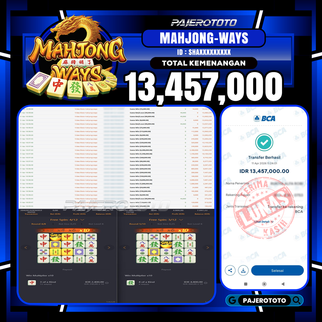 JACKPOT PAJEROTOTO SLOT MAHJONG WAYS Rp 13,457,000,- 11 APRIL 2026 – LUNAS..!!
