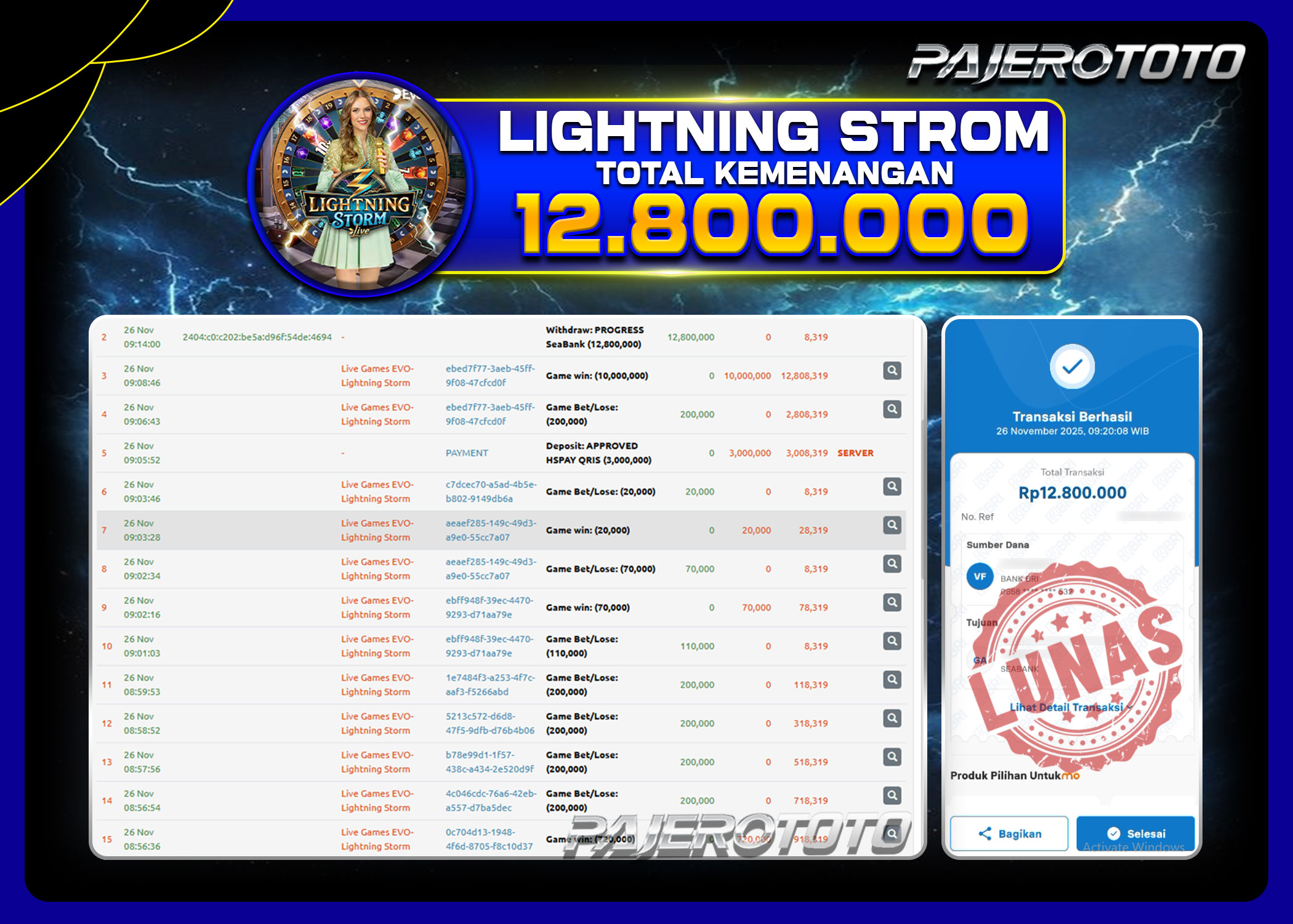 Live Casino Online – JACKPOT PAJEROTOTO LIVE CASINO LIGHTNING STROM Rp 12.800.000,- 26 NOVEMBER 2025 – LUNAS..!!