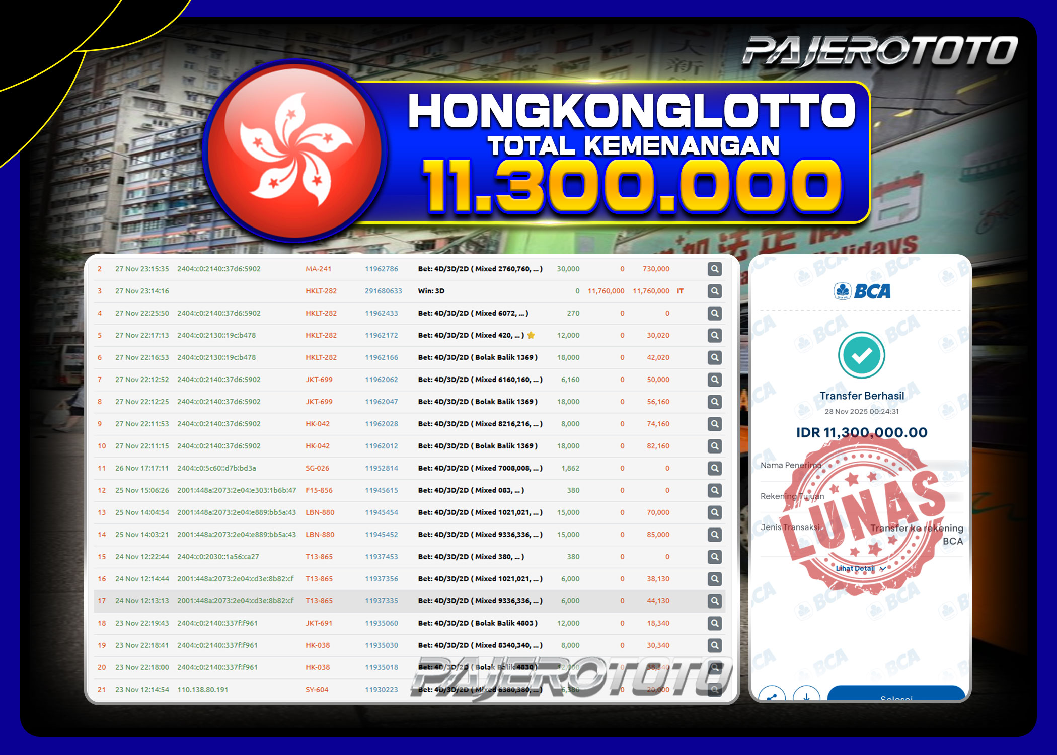 JACKPOT PAJEROTOTO TOGEL HONGKONG LOTTO Rp 11.300.000,- 28 NOVEMBER 2025 – LUNAS..!!