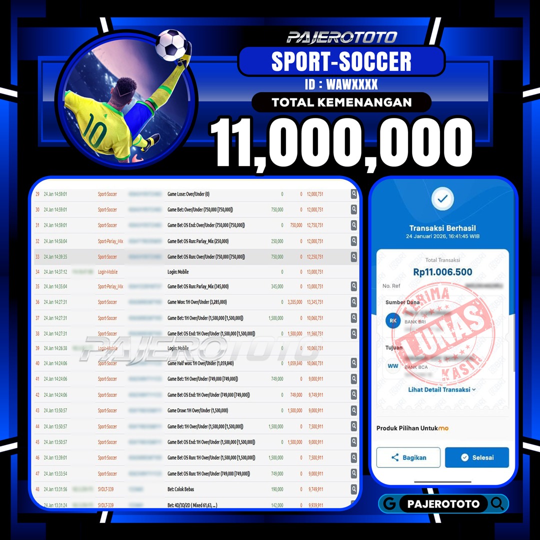JACKPOT PAJEROTOTO SPORTSBOOK SOCCER Rp 11.000.000,- 24 JANUARY 2026 – LUNAS..!!