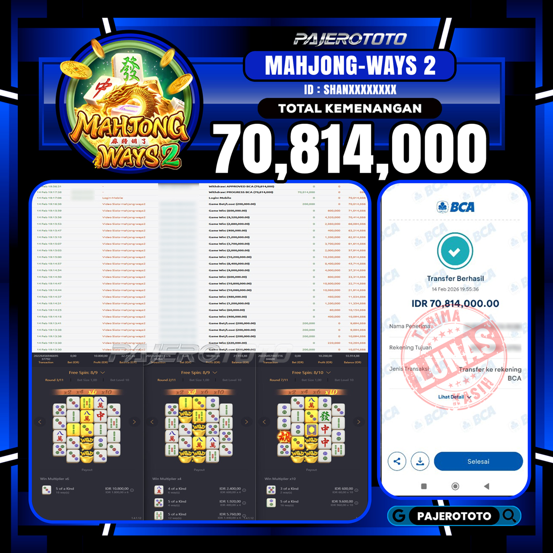 JACKPOT PAJEROTOTO SLOT MAHJONG WAYS 2 Rp 70,814,000,- 14 FEBRUARI 2026 – LUNAS..!!