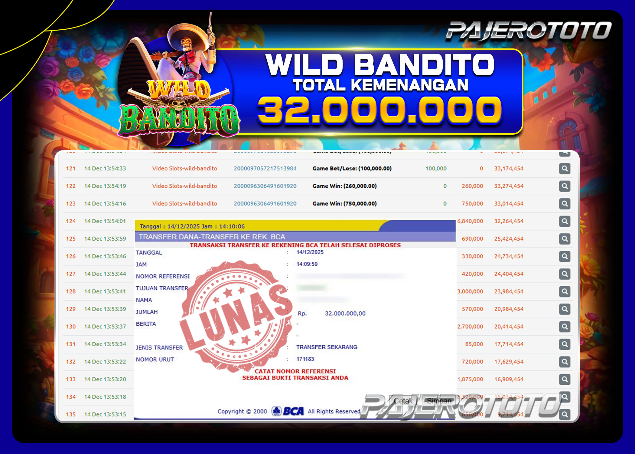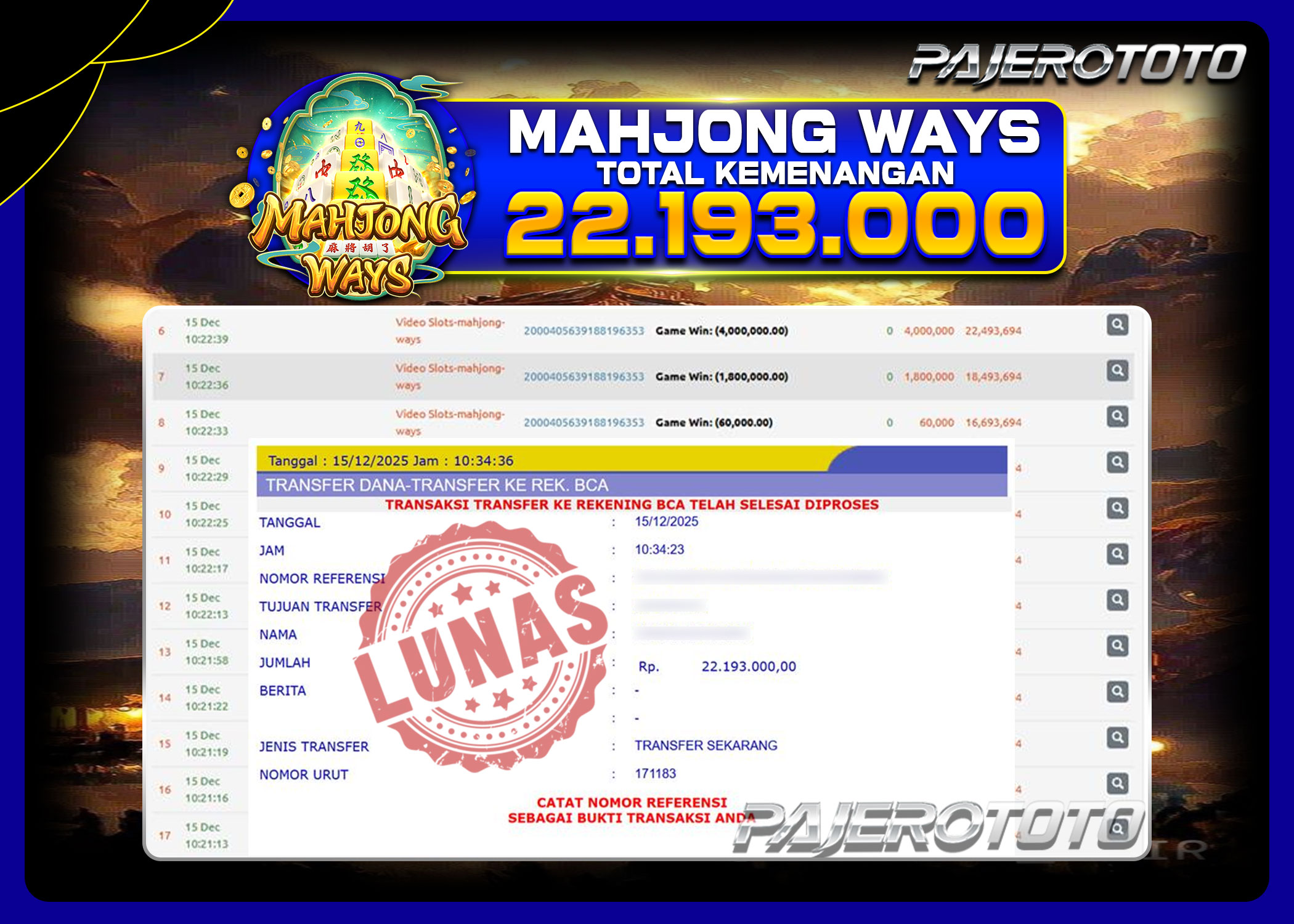 JACKPOT PAJEROTOTO LIVE CASINO BACCARAT Rp 15.000.000,- 19 DESEMBER 2025 – LUNAS..!!