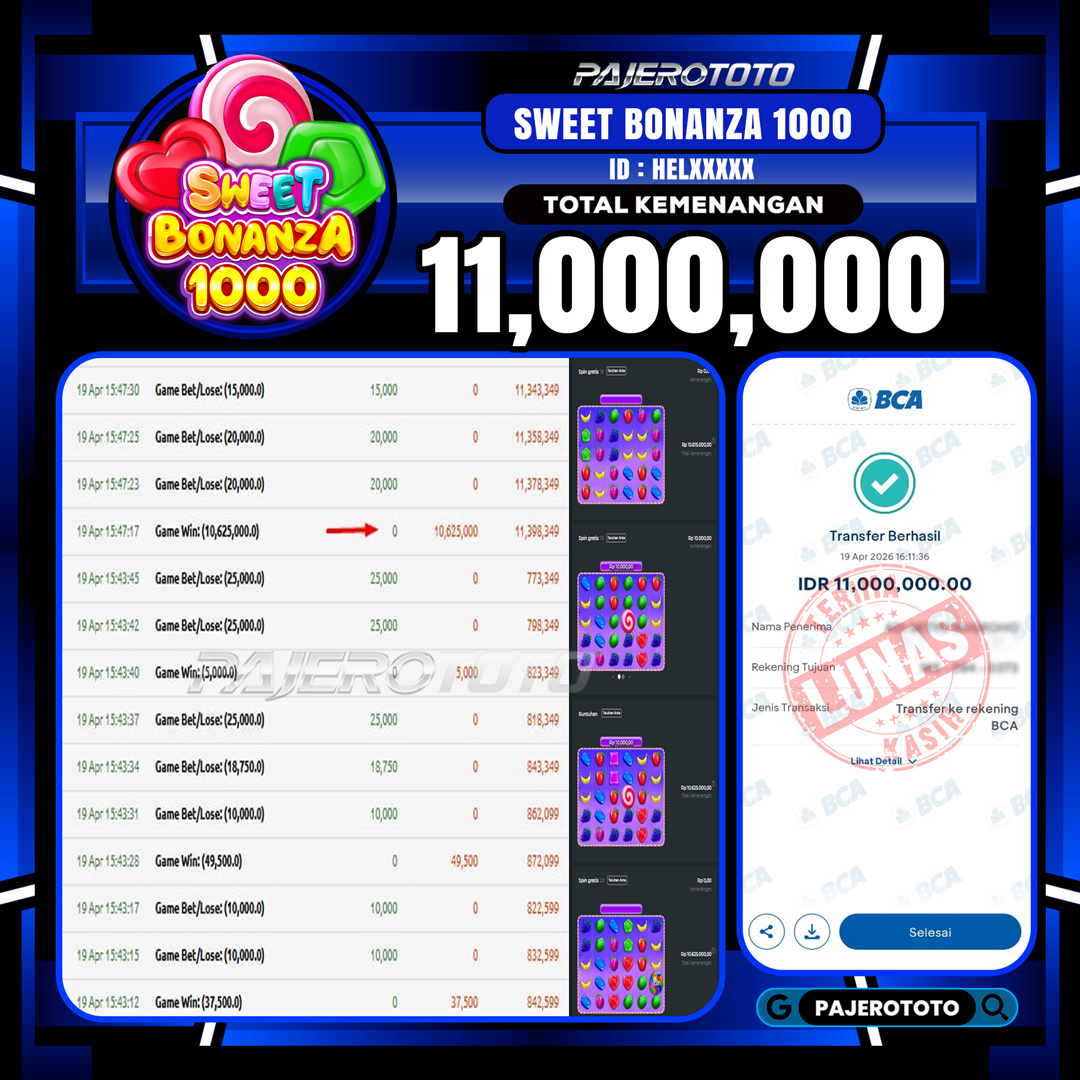 JACKPOT PAJEROTOTO SLOT SWEET BONANZA 1000 Rp 11,000,000,- 19 APRIL 2026 – LUNAS..!!