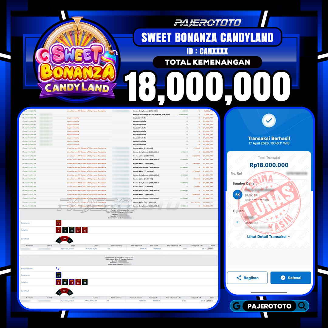 JACKPOT PAJEROTOTO LIVE GAMES SWEET BONANZA CANDYLAND Rp 18,000,000,- 17 APRIL 2026 – LUNAS..!!