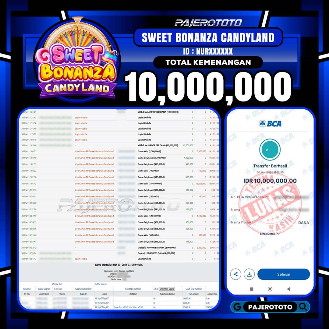 JACKPOT PAJEROTOTO LIVE GAMES SWEET BONANZA CANDYLAND Rp 10,000,000,- 30 MARET 2026 – LUNAS..!!