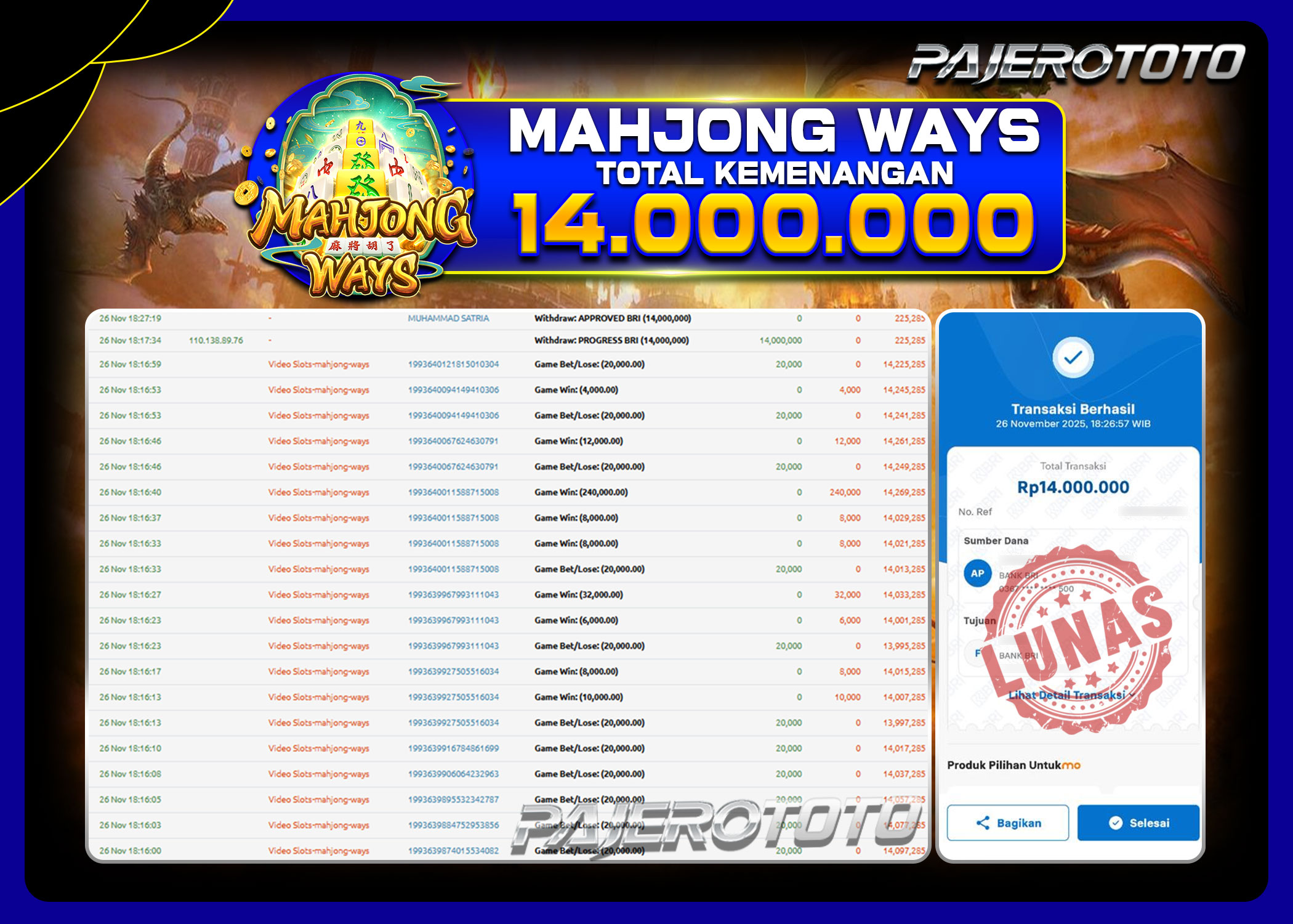 JACKPOT PAJEROTOTO SLOT MAHJONG WAYS Rp 14.000.000, – 26 NOVEMBER 2025 – LUNAS..!!
